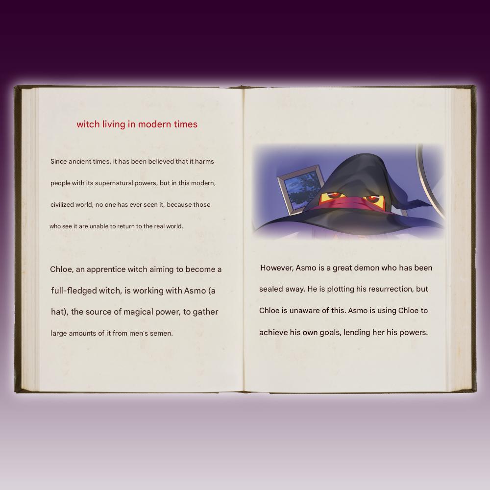 Since ancient times, it has been believed that it harms people with its supernatural powers, but in this modern, civilized world, no one has ever seen it, because those who see it are unable to return to the real world. Chloe, an apprentice witch aiming to become a full-fledged witch, is working with Asmo (a hat), the source of magical power, to gather large amounts of it from men's semen. However, Asmo is a great demon who has been sealed away. He is plotting his resurrection, but Chloe is unaware of this. Asmo is using Chloe to achieve his own goals, lending her his powers.