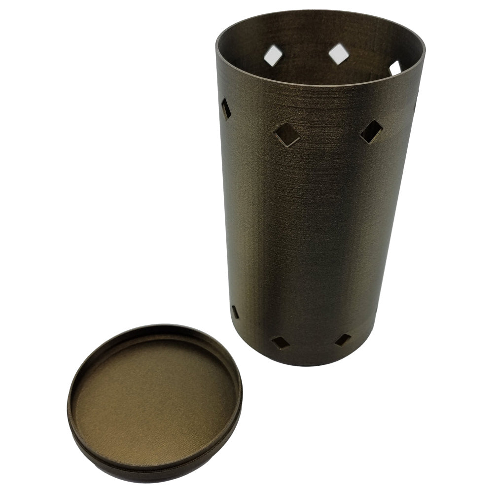 A simple but great box that protects your toys from curious eyes. No logo, just a nice box. The top has a screw cap that won't let you down when traveling. Air holes at the top and bottom ensure sufficient ventilation and prevent mold or fungus. The price is extra low to offer a plausible alternative to conventional toy bags.